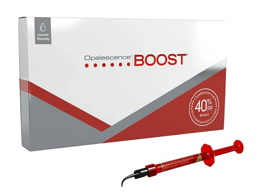Opalescence Boost es un gel de peróxido de hidrógeno al 40% con pH neutro para una máxima efi cacia y seguridad. Tras su activación, Opalescence Boost se dispensa directamente desde la jeringa. El producto fl uye de forma uniforme y no se derrama. Su distinguible color rojo contribuye a una colocación adecuada y asegura su remoción completa. Se recomiendan dos aplicaciones de 20 minutos por sesión, de 40 minutos. Se puede realizar una tercera aplicación de 20 minutos de duración si no se han logrado los resultados deseados y el paciente no experimenta sensibilidad. No realice más de tres aplicaciones por sesión.
