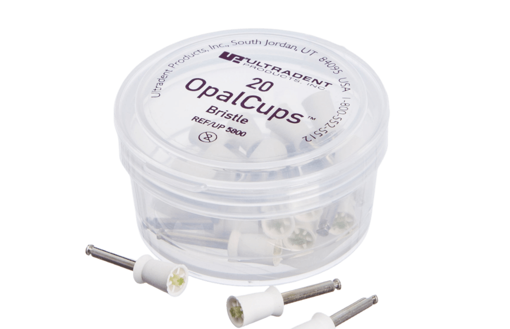 Las copas abrasivas OpalCup para contraángulo, con cepillo interno, se emplean con la técnica de microabrasión Opalustre para lograr una acción más agresiva y minimizar las salpicaduras. Las copas de acabado OpalCup se emplean con Opalustre para el micropulido de la superficie del esmalte recién tratada. Ambos tipos de OpalCup son autoclavables por un número limitado de ciclos.