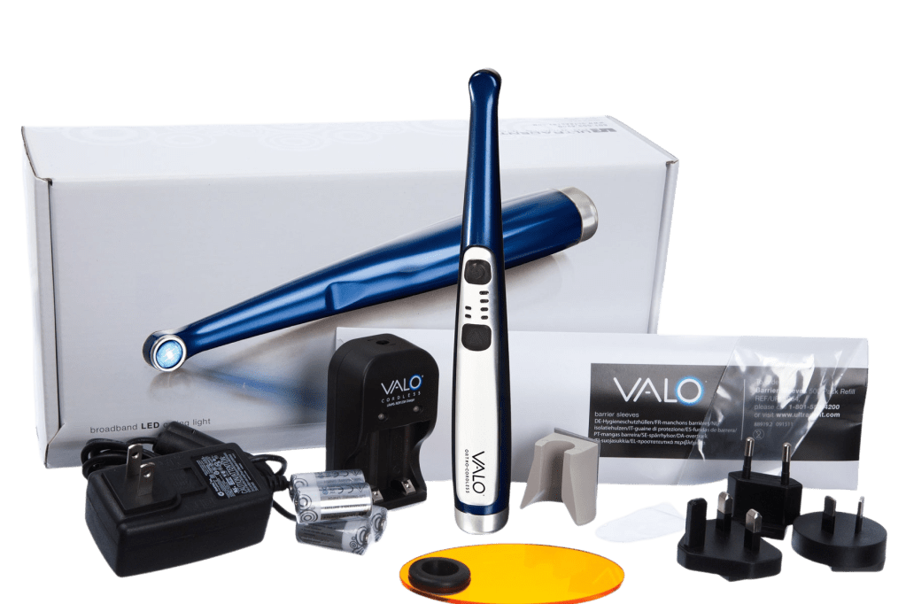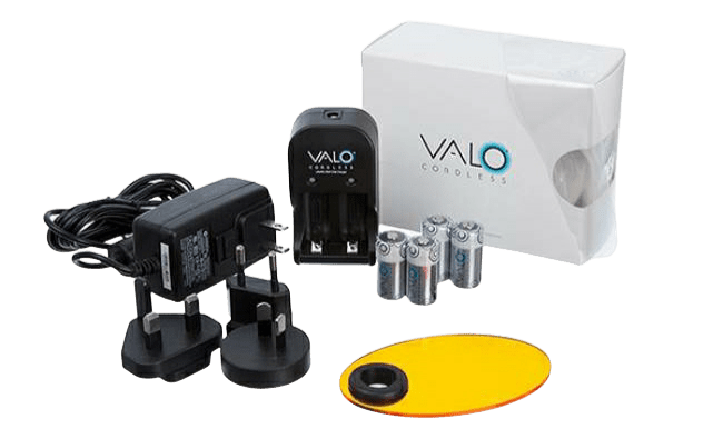 VALO Ortho Cordless utiliza un diodo emisor de luz (LED) de longitud de onda múltiple personalizado para producir una luz de alta intensidad a 385-515nm, que es capaz de polimerizar todos los materiales dentales fotopolimerizables. Esta intensidad también penetrará en la porcelana y es capaz de polimerizar cementos resinosos subyacentes similares a una luz halógena de calidad. VALO Ortho Cordless usa baterías recargables y un cargador de baterías adecuado corrientes de 100 a 240 voltios. La pieza de mano está diseñada para apoyarse en un soporte de unidad dental estándar o puede montarse a la medida utilizando el soporte incluido en el kit. VALO Ortho Cordless está equipado con un sensor que registra el movimiento de la luz; cuando no se utiliza la luz, VALO Ortho Cordless pasará automáticamente al modo de suspensión y cuando se mueva volverá a la configuración utilizada más recientemente.