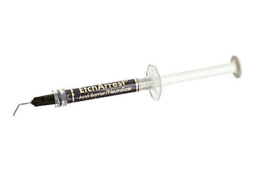 EtchArrest es un gel neutralizador de ácido con una base de bicarbonato sódico y calcio. Es lo suficientemente viscoso para no deslizarse por una superficie vertical y se enjuaga fácilmente con agua. Aplique la capa protectora de EtchArrest antes de colocar los agentes grabadores.