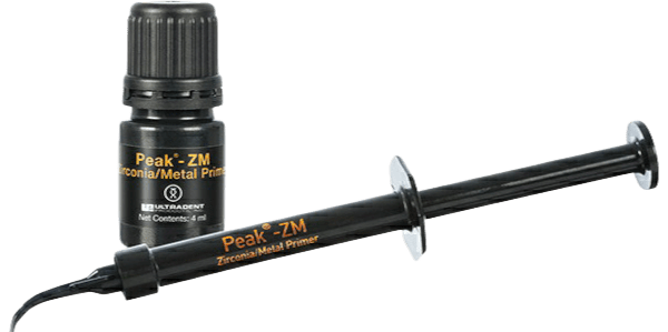 El primer para zirconia y metal Peak-ZM está específicamente diseñado para proporcionar una alta adhesión entre zirconia o superficies metálicas y el material de cementación. Gracias a la química que contiene 10-MDP, el Peak-ZM puede aumentar la resistencia de la adhesión en cinco veces en comparación con el uso de un cemento resinoso solo.1