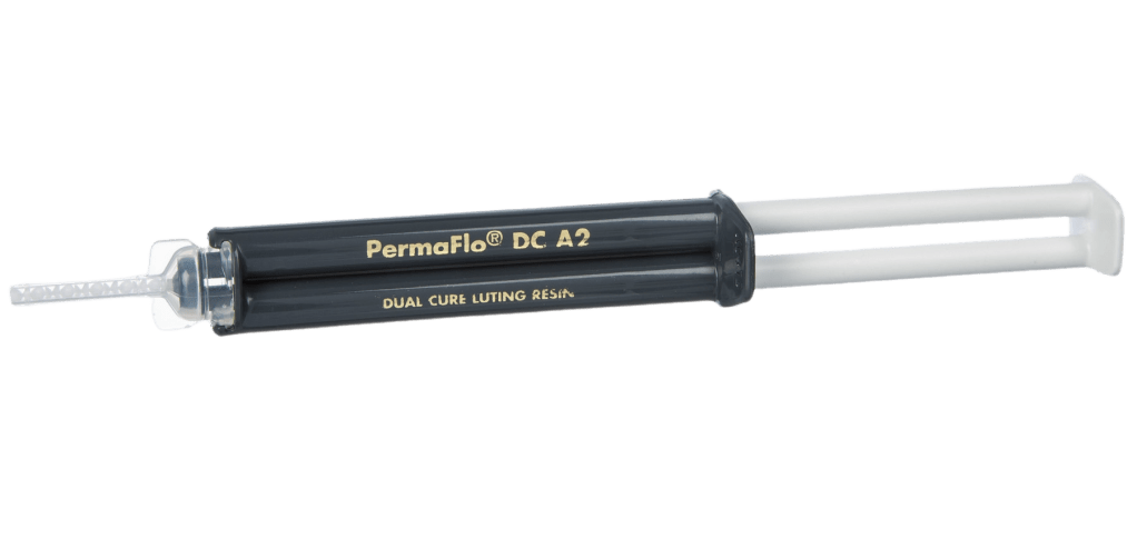 La resina cementante PermaFlo DC es una resina con muy alta carga, de partículas pequeñas, de polimerización dual. PermaFlo DC tiene el menor grosor de película conocido para resinas cementantes: sólo 9μm. A pesar de que tiene una alta carga de 70% por peso, PermaFlo DC fluye fácilmente a través de una punta de orificio pequeño, volviendo posible y práctico el cementado de pernos. El Primer A es una resina de tipo NTG-GMA; el Primer B es una resina propia.
