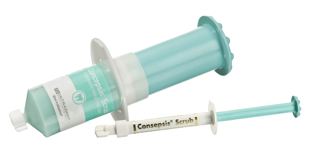 Consepsis Scrub es una pasta de abrasión desinfectante de gluconato de clorhexidina al 2,0% con un ligero sabor. El pulido con un desinfectante de calidad antes de restaurar minimiza el riesgo potencial de sensibilidad postoperatoria asociada con la infiltración de microorganismos en los túbulos dentinarios.