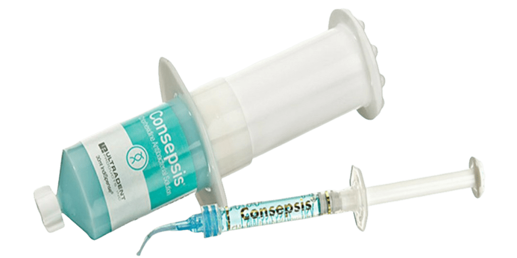 Consepsis antibacterial solution is recommended for procedural endodontic disinfection, as a final endodontic rinse prior to canal obturation,1–3 and prior to pulp capping. Consepsis solution should be used after smear layer removal for canal disinfection. Sodium hypochlorite and EDTA solutions should be rinsed and removed prior to using Consepsis solution.