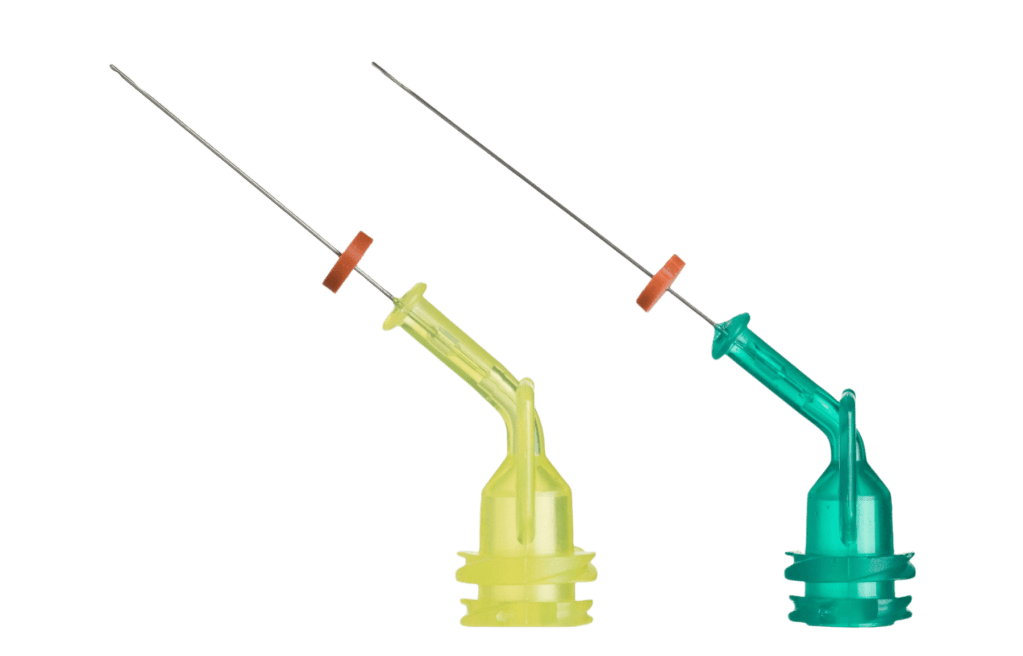 Cuerpo de plástico con cuello angulado y cánula metálica muy fina. El extremo apical de la punta es suave y flexible, mientras que el resto de la longitud es rígida, facilitando su inserción suave en el conducto radicular sin doblarse.