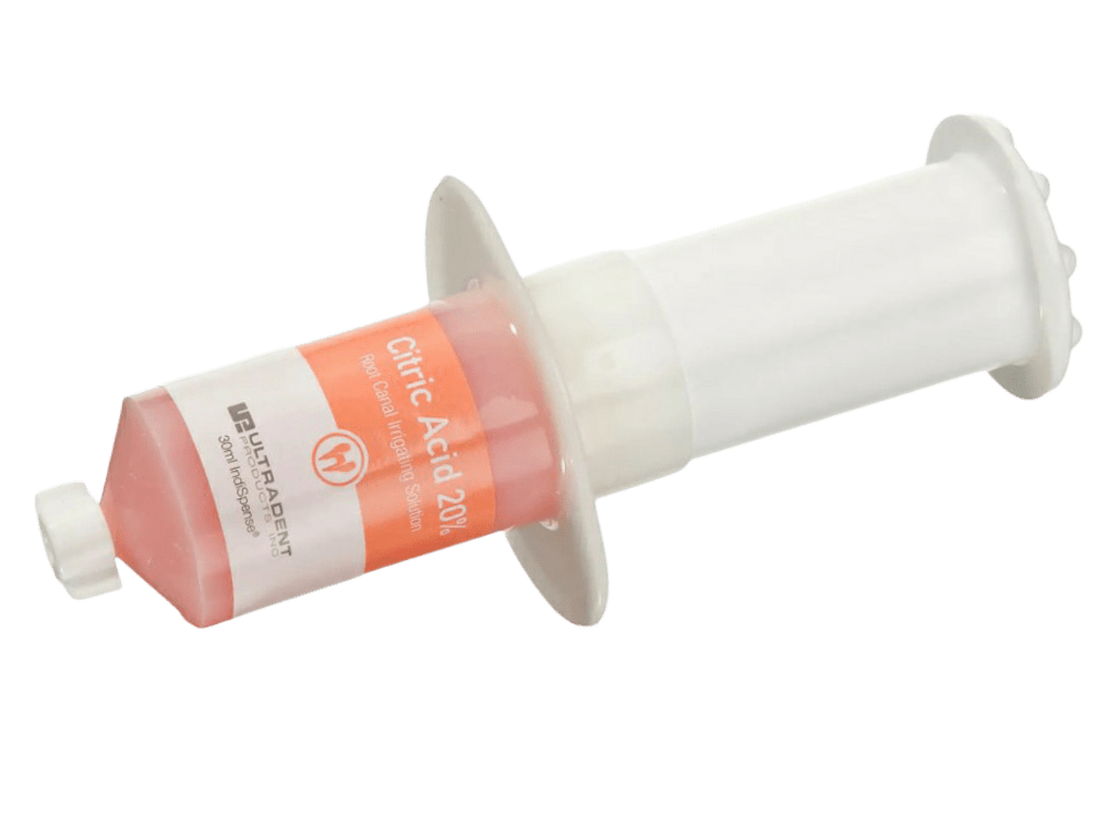 Ácido cítrico al 20% en una formulación ligeramente viscosa y con colorante para una mejor diferenciación. Elimina el barro dentinario antes de la obturación final del conducto.