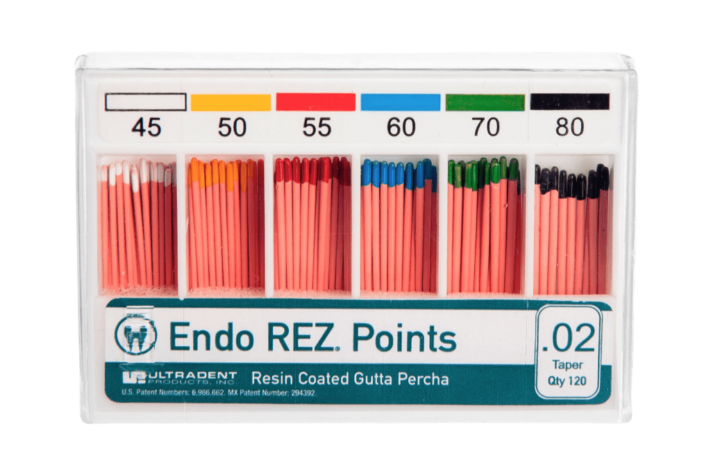 EndoREZ Points son puntas de gutapercha de tamaño ISO estándar y recubiertas con una fi na capa de resina que se adhieren químicamente con EndoREZ y otros sellantes con base de resina. Históricamente, la gutapercha sólo ha mantenido una unión química débil con los sellantes para conductos. Las EndoREZ Points son las primeras puntas de gutapercha capaces de lograr y de mantener una adhesión química fuerte con sellantes con base de resina.