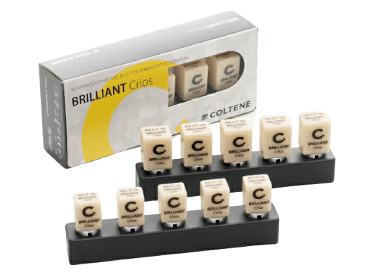 BRILLIANT Crios es un composite reforzado. El material combina todas las ventajas de un innovador material compuesto híbrido submicrónico con las de un proceso de fabricación CAD / CAM para obtener restauraciones fiables, estéticas y rápidas sin un proceso de cocción independiente. La fabricación constantemente controlada con curado térmico constante, le da al compuesto reforzado excelentes propiedades mecánicas. Dos tamaños y tres translucidez con 15 tonos ofrecen una amplia gama para un uso diario en la práctica odontológica.