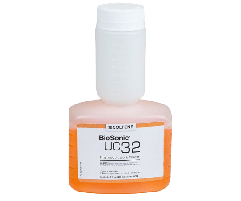 El limpiador ultrasónico enzimático BioSonic UC32 combina la detergencia no iónica del UC30 con enzimas que actúan para descomponer las partículas de suciedad rebeldes y aflojar la suciedad endurecida de sus instrumentos. El limpiador enzimático se puede utilizar como baño portador en su limpiador ultrasónico o como remojo previo del instrumento. Limpia eficazmente instrumentos dentales, coronas, puentes, dentaduras postizas y puntas de raspadores ultrasónicos. Cada botella de limpiador enzimático contiene 8 fl oz. y produce 8 galones o 30 litros de solución diluida. Nuestra exclusiva botella MeterDose® simplifica el proceso al dispensar exactamente la cantidad de solución necesaria sin desperdicios, derrames ni suciedad.
